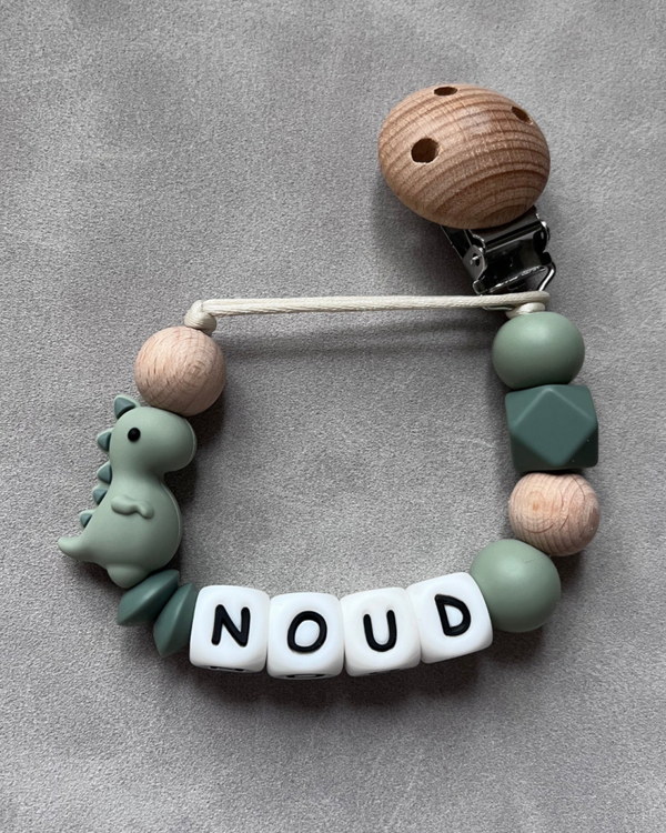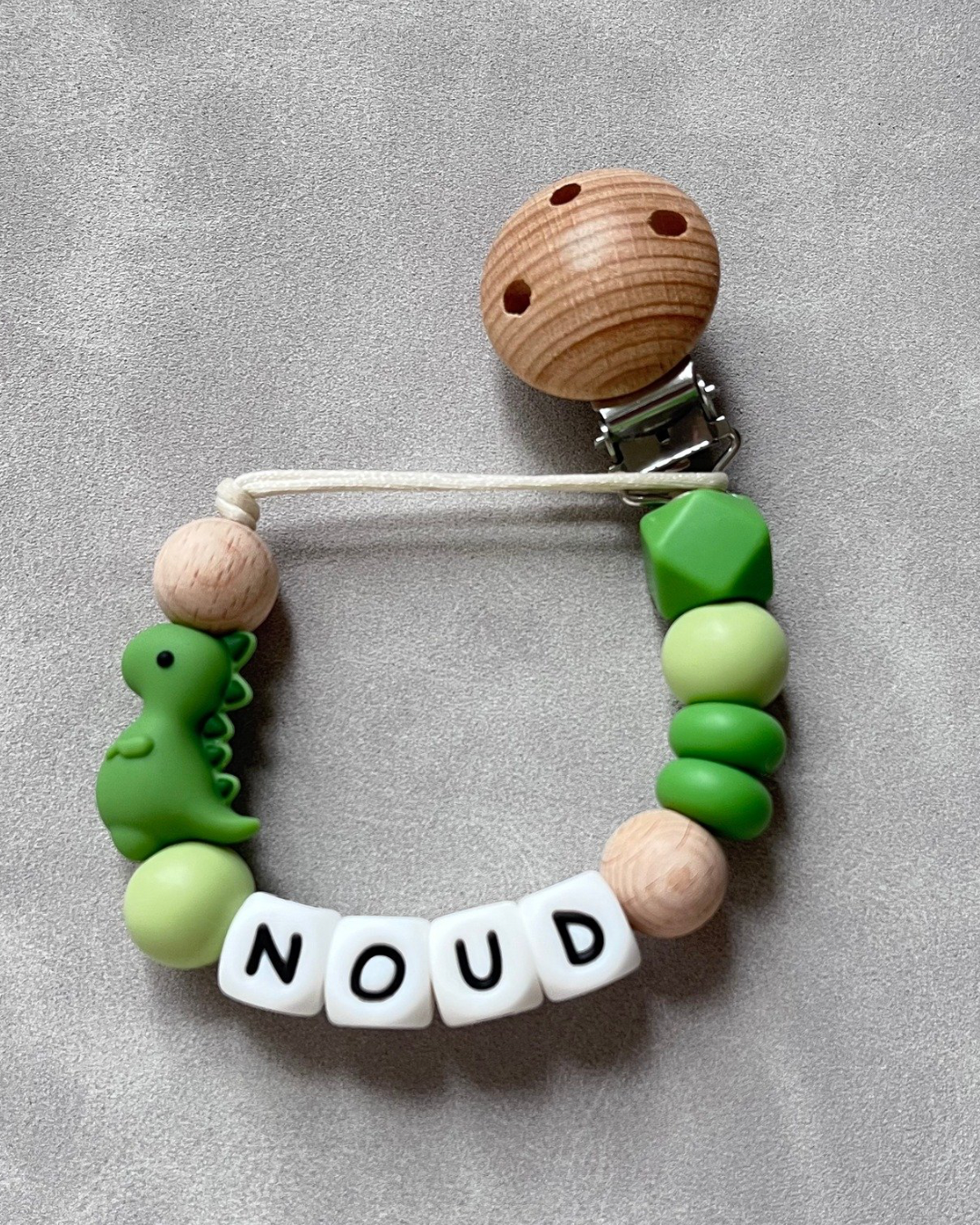 Ga je voor zachte natuurtinten of juist een stoere, speelse mix? Jij bepaalt hoe jouw dino-speenkoord eruit komt te zien.